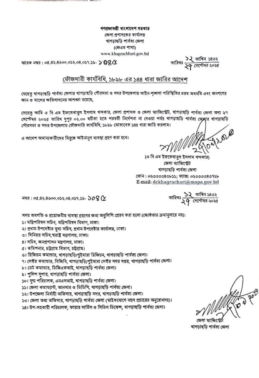 খাগড়াছড়িতে ১৪৪ ধারা জারি।