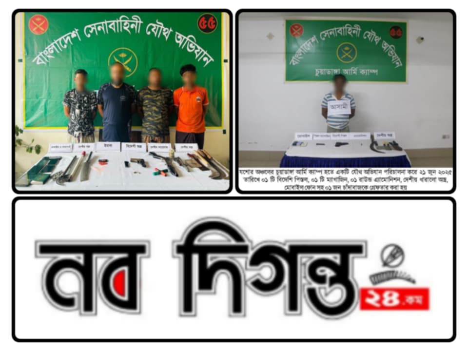 ২১ জুন ২০২৫ (শনিবার): গতরাত আনুমানিক ১ টা ৩০ মিনিটে সুনির্দিষ্ট গোয়েন্দা তথ্যের ভিত্তিতে সেনাবাহিনীর একটি টহল দল খুলনা শহরের টুটপাড়া এলাকায় অভিযান পরিচালনা করে কুখ্যাত সন্ত্রাসী বাহিনী 'বুলবুল গ্রুপের' ০৪ জন সদস্যকে গ্রেফতার করে। অভিযান কালে ০১ টি বিদেশী পিস্তল, ০২ টি স্থানীয়ভাবে তৈরি দেশীয় আগ্নেয়াস্ত্র, ০৬ টি বিভিন্ন প্রকার গোলাবারুদ, ১০৫ পিস ইয়াবা এবং সন্ত্রাসী কাজে ব্যবহৃত দেশীয় ধারালো অস্ত্র উদ্ধার করা হয়।