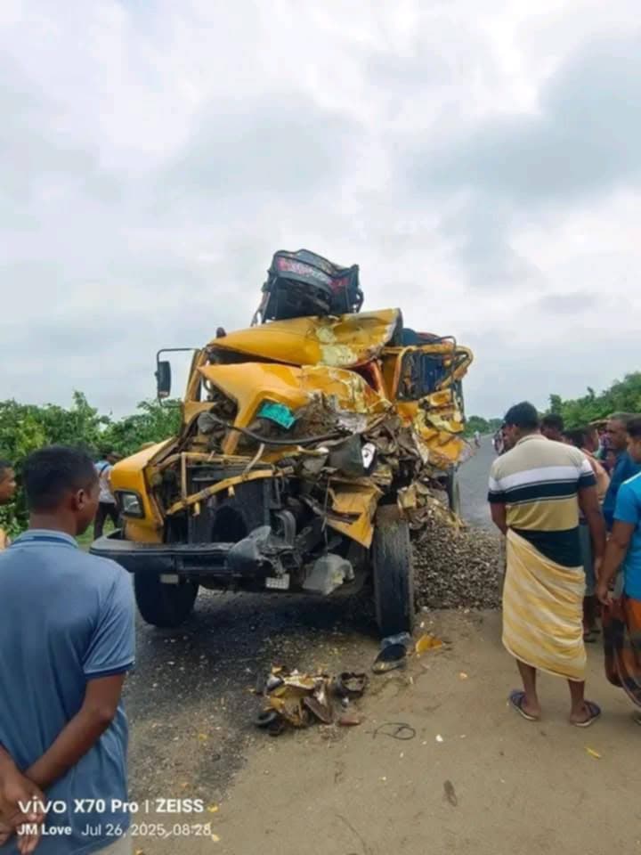 আতিকুর রহমান, স্টাফ রিপোর্টার: নওগাঁর মান্দায় দাঁড়িয়ে থাকা এক বালুবোঝাই ট্রাককে আরেক পাথরবোঝাই ট্রাক ধাক্কা দেওয়ার ঘটনায় হেলপার নিহত হয়েছেন। এ ঘটনায় গুরুতর আহত হয়েছেন ট্রাকের চালক। শনিবার (২৬ জুলাই) সকাল ৯টার দিকে উপজেলার নওগাঁ-রাজশাহী আঞ্চলিক মহাসড়কের চৌদ্দমাইল নামক এলাকায় এ দুর্ঘটনা ঘটে। মান্দা থানার ভারপ্রাপ্ত কর্মকর্তা (ওসি) মো. মনসুর রহমান বিষয়টি নিশ্চিত করেছেন। তবে তাৎক্ষণিক হতাহতদের নাম-পরিচয় জানা যায়নি। পুলিশ ও স্থানীয় সূত্রে জানা গেছে, রাজশাহীগামী এক বালুবোঝাই ট্রাক সড়কের পাশে দাঁড়ানো ছিল। ট্রাকচালক ও হেলপার পাশের এক পেট্রোল পাম্পে ওয়াশরুমে যান। এ সময় একই দিক থেকে আসা অপর পাথরবোঝাই ট্রাক নিয়ন্ত্রণ হারিয়ে বালুবোঝাই ট্রাকটিকে সজোরে ধাক্কা দিলে বালুবোঝাই ট্রাকটি রাস্তার নিচে উল্টে যায়। এসময় ঘটনাস্থলেই পাথরবোঝাই ট্রাকের হেলপার নিহত হন। পরে খবর পেয়ে পুলিশ ও ফায়ার সার্ভিসের কর্মীরা ঘটনাস্থলে গিয়ে নিহতের মরদেহ উদ্ধার করে। গুরুতর আহত অবস্থায় ট্রাকের চালককে উদ্ধার করে মান্দা উপজেলা স্বাস্থ্য কমপ্লেক্সে ভর্তি করা হয়। মান্দা থানার ওসি মো. মনসুর রহমান বলেন, খবর পেয়ে পুলিশ ঘটনাস্থলে পৌঁছে মরদেহ উদ্ধার করেছে। নিহত হেলপারের নাম পরিচয় এখনো জানা যায়নি। পরিচয় উদ্ধারের চেষ্টা চলছে।