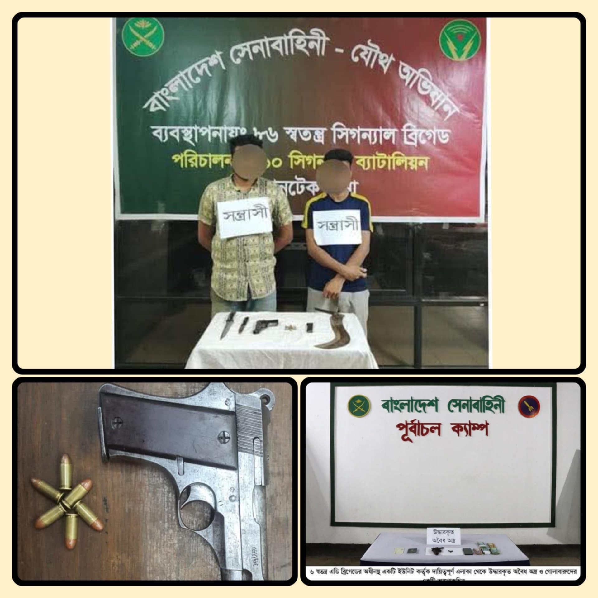 ঢাকা, ১৯ জুলাই ২০২৫ (শনিবার): গত রাত আনুমানিক ১ টায় রাজধানীর ভাসানটেক এলাকায় সুনির্দিষ্ট গোয়েন্দা তথ্যের ভিত্তিতে সেনাবাহিনীর নেতৃত্বে একটি যৌথ অভিযান পরিচালনা করে স্থানীয় সন্ত্রাসী চক্র 'বাবলু গ্রুপ' এর দুইজন সক্রিয় সদস্য মোঃ আমির হামজা ইয়ামিন (২৫) এবং মোঃ তানভীর আহমেদ সবুজ (২৭) ’কে ১টি বিদেশি পিস্তল (ম্যাগাজিন সহ), ৬ রাউন্ড এ্যামোনিশন এবং বিভিন্ন দেশীয় ধারালো অস্ত্রসহ গ্রেফতার করা হয়। গ্রেফতারকৃতদের বিরুদ্ধে চাঁদাবাজিসহ বিভিন্ন অপরাধমূলক কর্মকাণ্ডে জড়িত থাকার অভিযোগ রয়েছে।