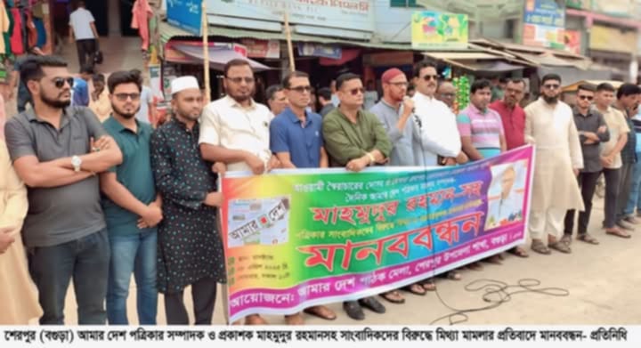 বগুড়ার শেরপুরে দৈনিক আমার দেশ পত্রিকার সম্পাদক ও প্রকাশক মাহমুদুর রহমানসহ সাংবাদিকদের বিরুদ্ধে মিথ্যা ও ষড়যন্ত্রমূলক মামলার প্রতিবাদে মানববন্ধন অনুষ্ঠিত হয়েছে। আজ সোমবার (২৮ এপ্রিল) বেলা ১১টার সময় বাসষ্ট্যান্ড শেরপুর প্রেসক্লাবের সামনে আমার দেশ পাঠকমেলার আয়োজনে। উক্ত মানববন্ধন অনুষ্ঠানে সভাপতিত্ব করেন দৈনিক আমার দেশ পত্রিকার শেরপুর উপজেলা প্রতিনিধি ও শেরপুর অনলাইন প্রেসক্লাবের সভাপতি আবু জাহের। মানববন্ধনে বক্তব্য রাখেন বিএনপির কেন্দ্রীয় নির্বাহী কমিটির সদস্য ও সাবেক উপজেলা চেয়ারম্যান কে এম মাহবুবুর রহমান হারেজ, বগুড়া জেলা বেএনপির সাবেক উপদেষ্ঠা ও সাবেক পৌর মেয়র আলহাজ¦ জানে আলম খোকা, পৌর বিএনপির সভাপতি ও সাবেক মেয়র স্বাধীন কুমার কুন্ডু, বিশিষ্ট ব্যবসায়ী আলহাজ¦ শফিকুল ইসলাম শিরু, বিএনপি নেতা মোস্তাফিজার রহমান নিলু, দৈনিক নয়াদিগন্ত ও করতোয়া পত্রিকার প্রতিনিধি আকরাম হোসাইন, দৈনিক ইত্তেফাক পত্রিকার উপজেলা প্রতিনিধি ও শেরপর প্রেসক্লাবের সাধারণ সম্পাদক আব্দুল মান্নান, সাংবাদিক শাহজামাল কামাল, আব্দুল ওয়াদুদ, শহিদুল ইসলাম শাওন, জাহিদ হাসান, টি এম কামাল, উৎপল মালাকার, আব্দুল মোমিন, জাহিদুল ইসলাম, হিমন কুমার সরকার, সোলায়মান, আহসান হাবিব শুভ, শ্রমিক নেতা শওকত খন্দকার, রাজু আহম্মেদ, মিলন, মোখলেছুর রহমান, ময়নুল কবির নিপুন, মেহেদী হাসান মিঠুসহ বিভিন্ন শ্রেনী পেশার মানুষ মানববন্ধনে অংশগ্রহন করেন। মানববন্ধনে বক্তারা বলেন, ফ্যাসিস্ট হাসিনা পালিয়ে গেলেও তার দোসররা আজও দেশের বিরুদ্ধে নানা ষঢ়যন্ত্রে লিপ্ত রয়েছে। আওয়ামী শাসনাআমলে ভারতীয় আগ্রাসন, ফ্যাসিবাদকে প্রলম্বিত করা ও বিচারবহির্ভূত হত্যাকান্ডের অন্যতম মিডিয়া ৭১ টেলিভিশন বাংলাদেশের বিরুদ্ধে এখনো ষড়যন্ত্র করে আসছে। অবিলম্বে এদের বিচারের আওতায় আনা হলে ভবিষ্যতে কেও এরকম ধৃষ্টতা দেখাবে না। সম্পাদক মাহমুদুর রহমান দেশের স্বার্থে ১-১১ সরকার থেকে শুরু করে ৭১ টিভিসহ ভারতীয় মিডিয়ার বিরুদ্ধে জীবন বাজি রেখে একাই লড়াই করে আসছেন। জুলাই বিপ্লবের পর পরাজিত মিডিয়ার রক্তের দাগ না শুকাতেই তার প্রতিশোধের প্রথম পদক্ষেপের অংশ হিসেবে এই মামলা করেছে মেঘনা গ্রুপের চেয়ারম্যান মোস্তফা কামাল। এই ষড়যন্ত্রের দাঁতভাঙা জবাব দিতে হবে। বক্তারা আরো বলেন আমাদের স্বাধীনতা, সার্বভৌমত্ব ও সাংস্কৃতিক আগ্রাসনের বিরুদ্ধে লড়াকু সৈনিক মজলুম সম্পাদক ও প্রকাশক মাহমুদুর রহমানসহ পত্রিকার সাংবাদিকদের বিরুদ্ধে মিথ্যা ও ষড়যন্ত্রমূলক মামলা প্রত্যাহারের দাবি জানান।