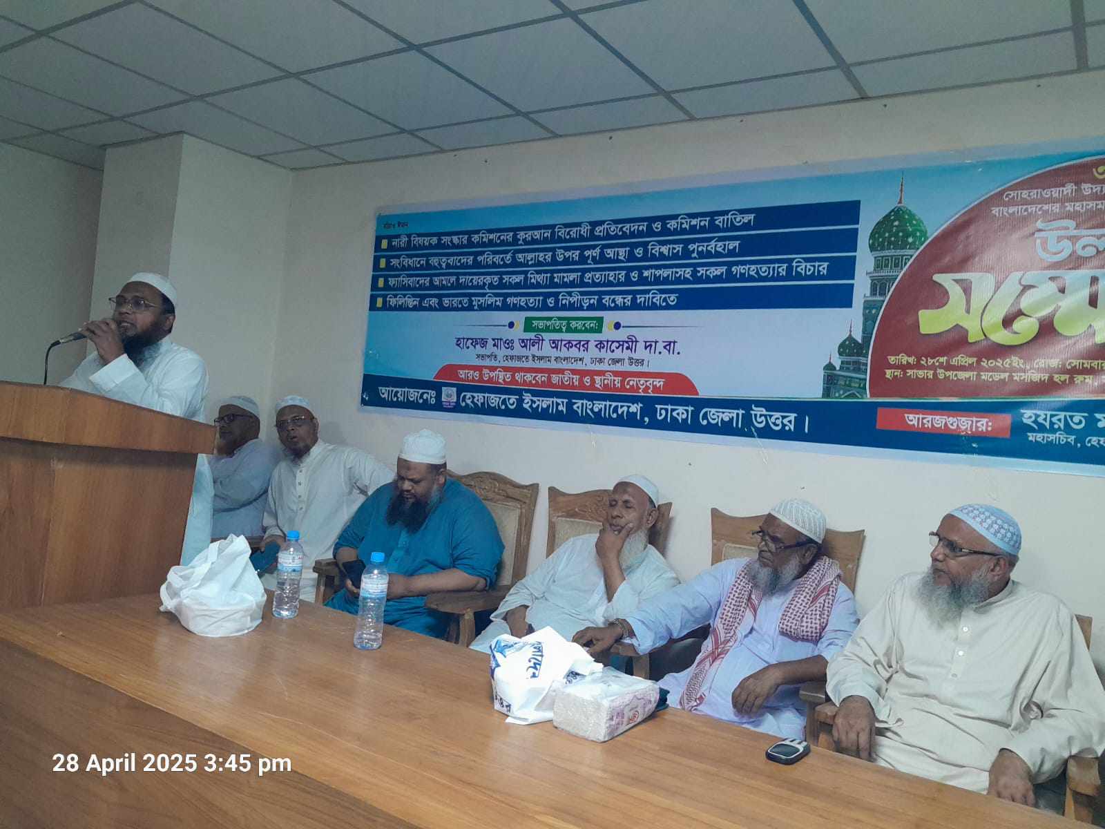 আগামী ৩-মে শনিবার, সকাল ৯টায়, রাজধানী ঢাকার ঐতিহাসিক সোহরাওয়ার্দী উদ্যানে হেফাজতে ইসলাম বাংলাদেশের কেন্দ্র ঘোষিত মহাসমাবেশ সফল করার লক্ষ্যে আজ (২৮ এপ্রিল, সোমবার, বা'দ জোহর) সাভার মডেল মসজিদে হেফাজতে ইসলাম ঢাকা জেলা উত্তরের উদ্যোগে এক উলামা সম্মেলন অনুষ্ঠিত হয়। এতে ঢাকা জেলা উত্তরের সভাপতি মাওলানা আলী আকবার কাসেমীর সভাপতিত্বে বিশেষ অতিথি হিসেবে বক্তব্য রাখেন, কেন্দ্রীয় সহকারী সাংগঠনিক সম্পাদক মুফতি জাবের কাসেমী ও কেন্দ্রীয় প্রচার সম্পাদক মুফতি কিফায়াতুল্লাহ আজহারী। সম্মেলনে স্বাগত বক্তব্য রাখেন, ঢাকা জেলা উত্তরের সাধারণ সম্পাদক মাওলানা আলী আযম।