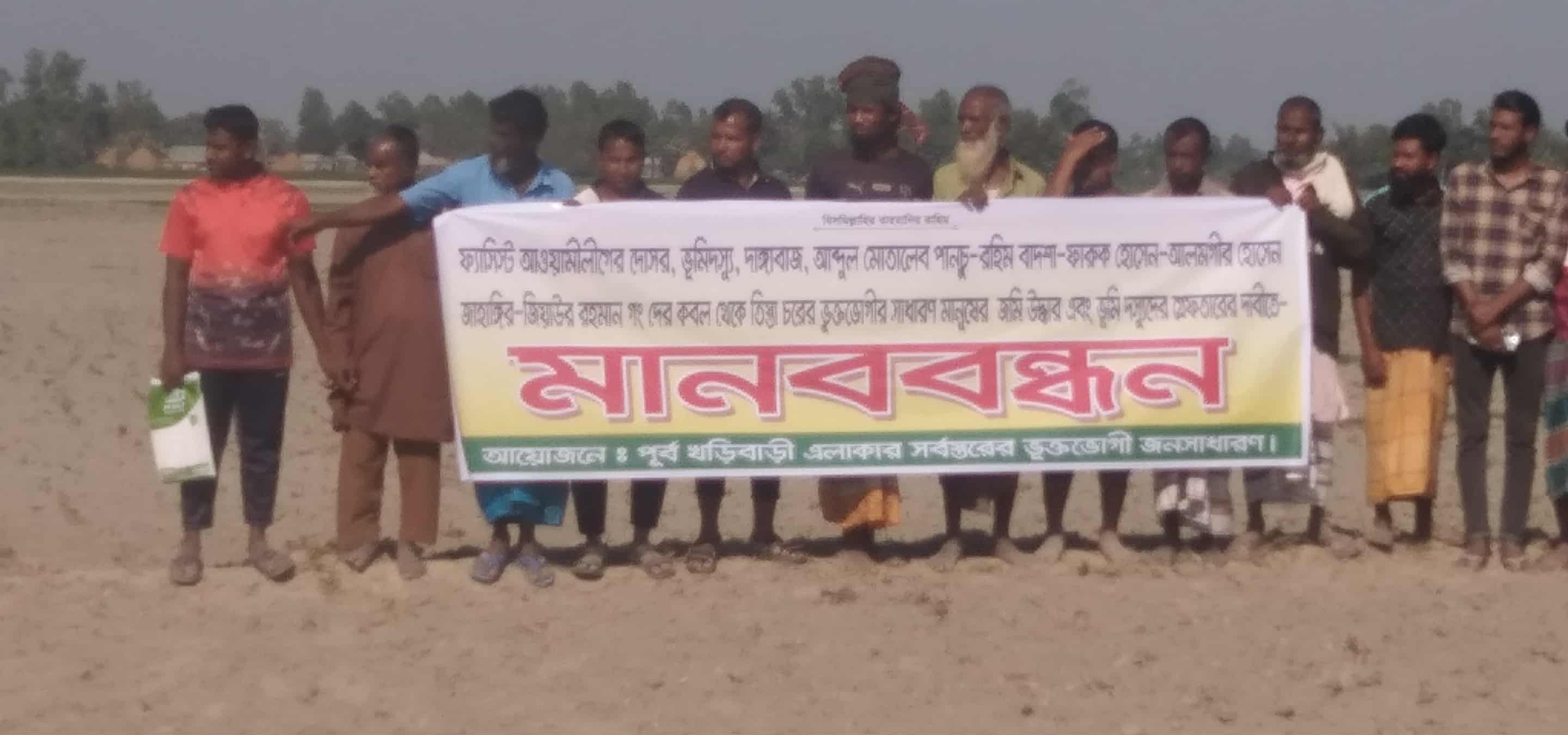 ডিমলা মামুন ডিমলা নীলফামারী প্রতিনিধি: নীলফামারীর ডিমলা উপজেলা টেপাখড়িবাড়ী ইউনিয়ন টাপুর চড়ে জমি দখল, ভয়ভীতি, হামলা মামলার মাধ্যমে সাধারণ মানুষকে হয়রানির প্রতিবাদে ১০( বুধবার) ডিসেম্বর এলাকাবাসী মানববন্ধনের আয়োজন করেন। এতে