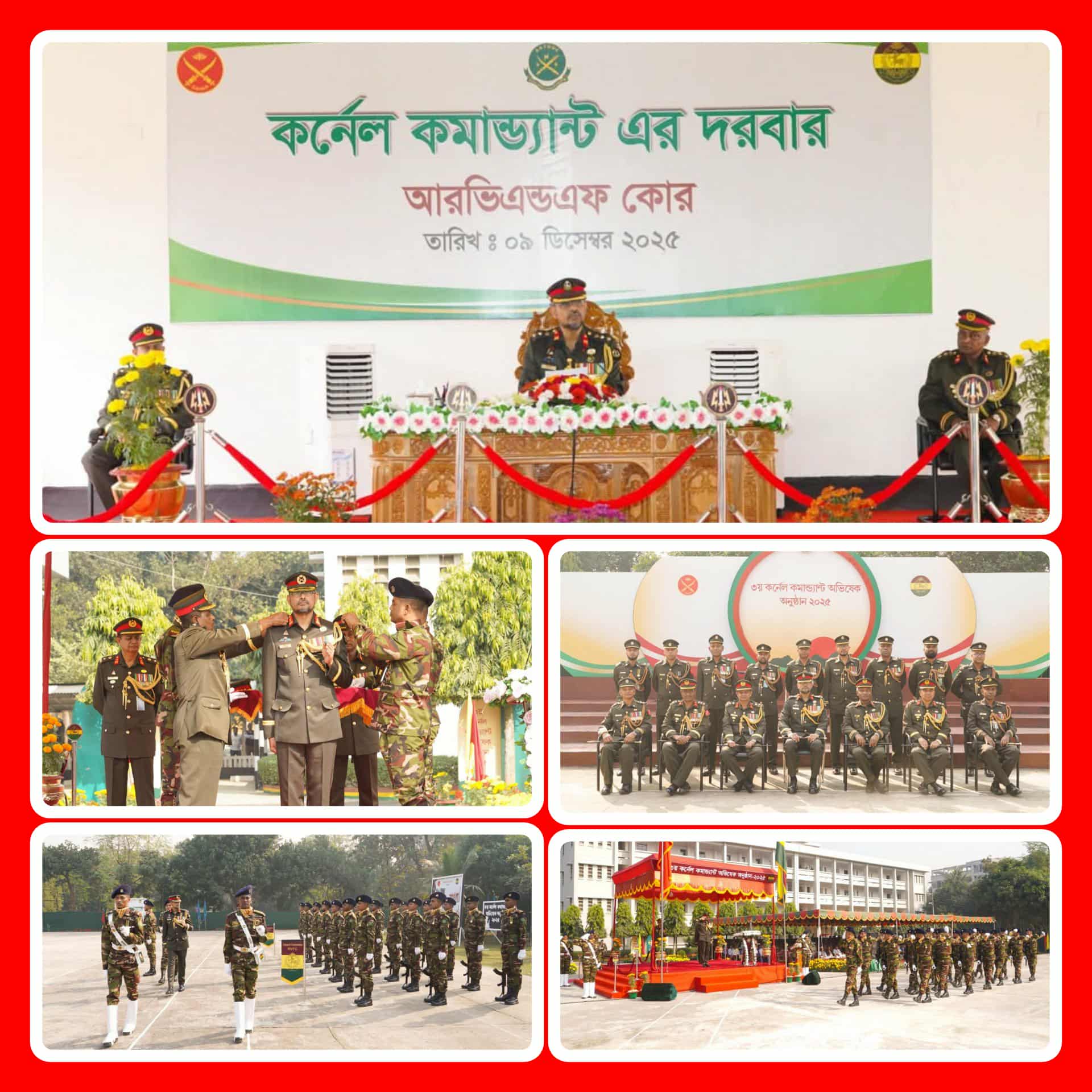 মনা নিজস্ব প্রতিনিধিঃ ঢাকা, ০৯ ডিসেম্বর ২০২৫ (মঙ্গলবার): আজ সাভার সেনানিবাসস্থ রিমাউন্ট ভেটেরিনারি এন্ড ফার্ম (আরভিএন্ডএফ) ডিপোতে বাংলাদেশ সেনাবাহিনীর আরভিএন্ডএফ কোরের ৩য় কর্নেল কমান্ড্যান্ট হিসেবে অভিষিক্ত হলেন মেজর জেনারেল এস