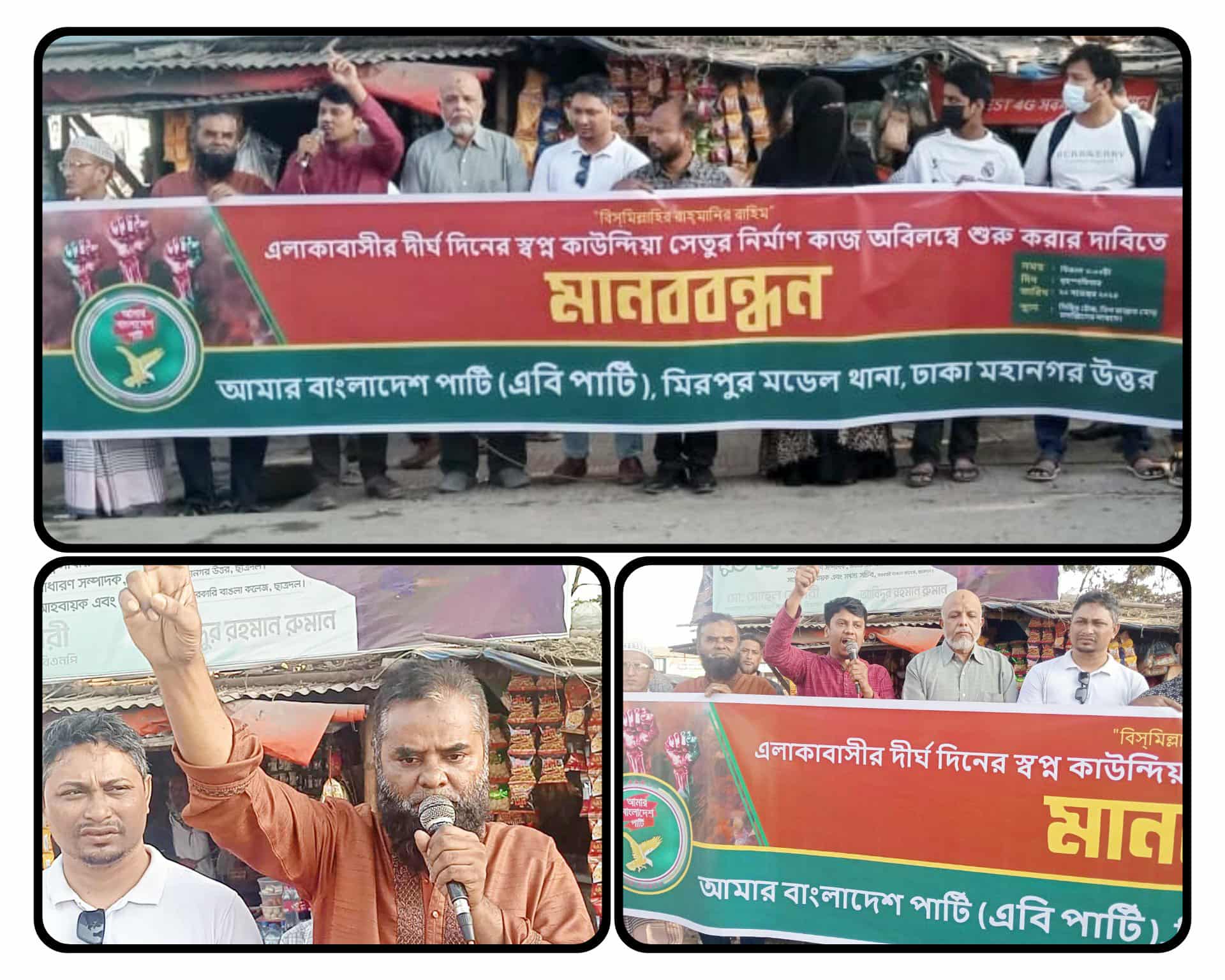 মনা নিজস্ব প্রতিনিধিঃ আজ ২০শে নভেম্বর বিকেলে দিয়াবাড়ি সিরনিরটেক ঘাট সংলগ্ন সড়কে কাউন্দিয়া ব্রিজের নির্মাণ কাজ শুরুর দাবিতে আমার বাংলাদেশ (এবি) পার্টির সৌজন্যে একটি মানববন্ধন অনুষ্ঠিত হয় , মানববন্ধনে প্রধান