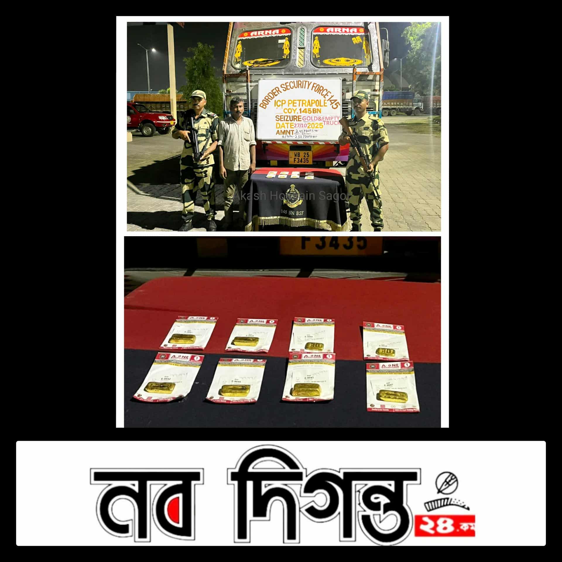 যশোর বেনাপোল সীমান্তের ওপারে ১ কেজি ৯৭৫ গ্রাম ওজনের ৮টি স্বর্ণের বার সই ট্রাক চালক আটক