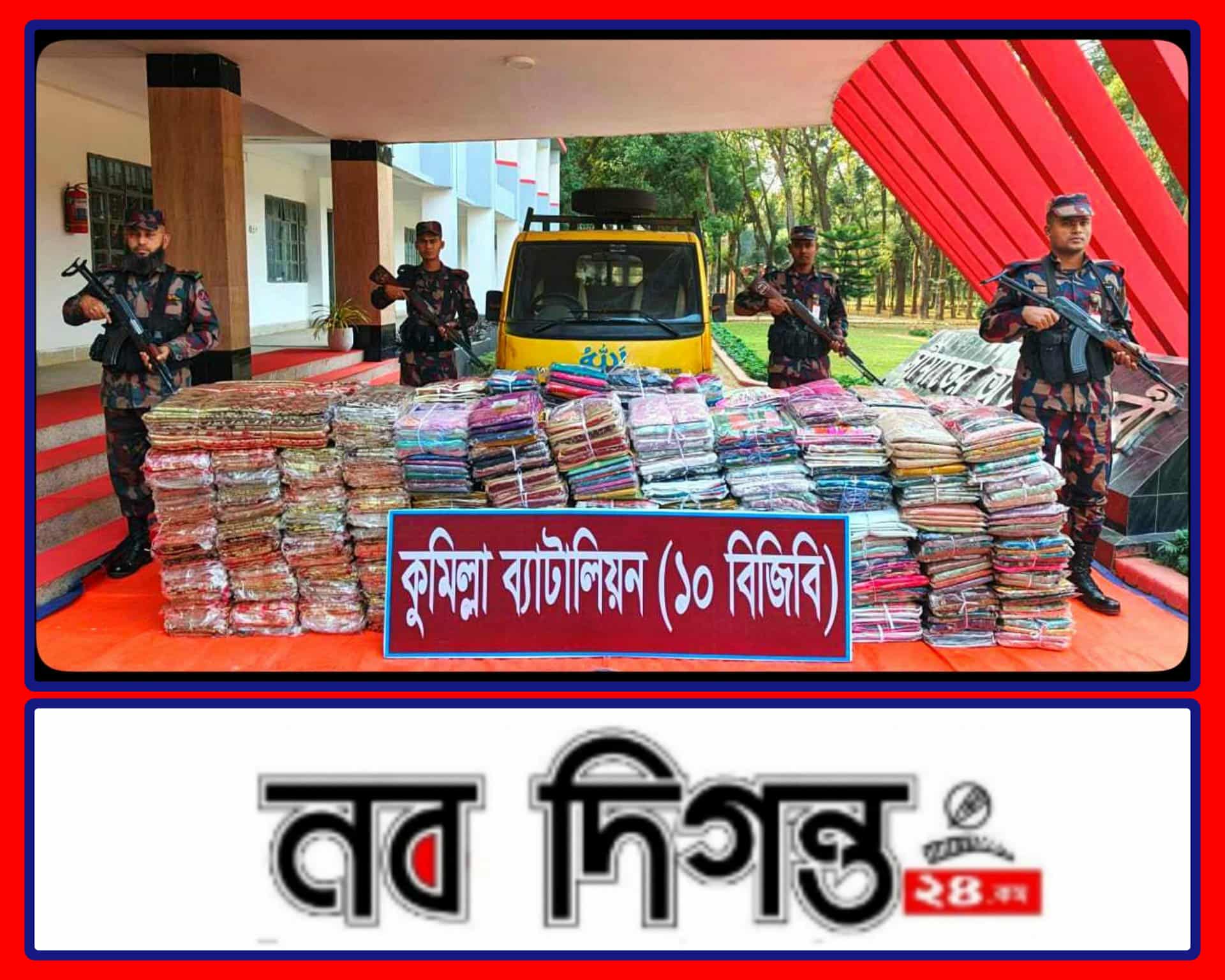 কুমিল্লা সীমান্তে চোরাচালান বিরোধী অভিযানে একটি মিনি পিকআপসহ বিপুল পরিমাণ অবৈধ ভারতীয় শাড়ি, থ্রি-পিস এবং বাজি জব্দ করেছে বর্ডার গার্ড বাংলাদেশ (বিজিবি)